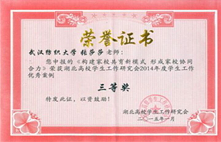 张莎莎老师申报的《构建家校共育新模式,形成家校协同合力》荣获湖北高校学生工作研究会2014年度学生工作案例省三等奖。