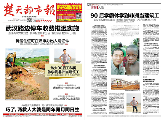 4月18日,《楚天都市报》以“90后学霸休学到非洲当建筑工”为题,头版深度报道了百花堂