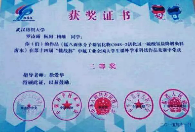 由徐爱华老师指导,罗诗露、阮阳、梅维等同学的《锰八面体分子筛氧化物(OMS-2)活化过一硫酸氢盐降解染料废水》参赛作品,经过网络初评、集中复评、决赛答辩等环节,得到评委们的一致好评,最终获得全国二等奖的荣誉。罗诗露同学勤学善思,在徐爱华副教授悉心指导下,在大二就完成两篇论文发表在SCI上,并成功申请到一项发明专利。