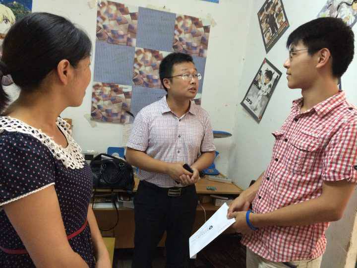 8月3日下午,环境工程学院院长夏东升来到了2015级新生杜宇航家,详细了解他的生活和学习情况,并送去了慰问金。环境工程学院从7月20日就在网上开展了迎新工作。通过QQ群,新生和学院领导、专业老师、辅导员在群里亲密互动。学院还通过电话与每名录取的学生取得了联系,告知新生群号。当学院得知杜宇航高考529分,并立志从事环境保护工作时,学院决定到其家里家访。