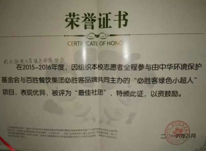 近期,从第七届中国青年环保组织交流合作论坛传来喜讯,我校绿色环保协会荣膺多项荣誉,包括“全国最佳社团”、7项“优秀志愿者”奖项。本次论坛在江苏南京举行,由中华环保基金会主办,中国青年环保志愿者服务中心、必胜客集团承办,来自全国各地的150名青年环保组织代表参加论坛。