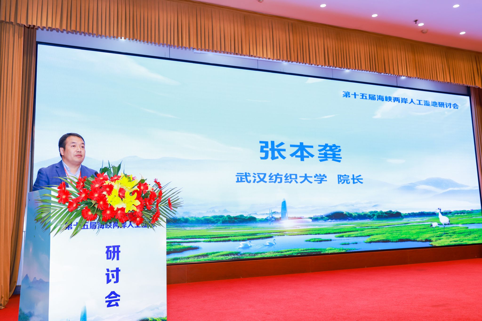 张本龚副院长详细介绍了学校作为全国唯一以"纺织"命名的行业特色高校的办学定位、学科布局与科研平台建设。他指出,人工湿地技术以其净化效率高、投资运行成本低、生态服务功能多样等优势,在纺织废水综合治理方面也展现出广阔前景,学校在纺织废水处理及资源循环利用方面具有特色研究方向,后期将继续支持跨学科团队开展湿地新材料、绿色工艺与生态过程的融合研究,与海峡两岸科研机构进一步加强合作,共同推进人工湿地技术创新与应用,为推动人工湿地技术向智能化、材料化、系统化方向发展贡献力量。