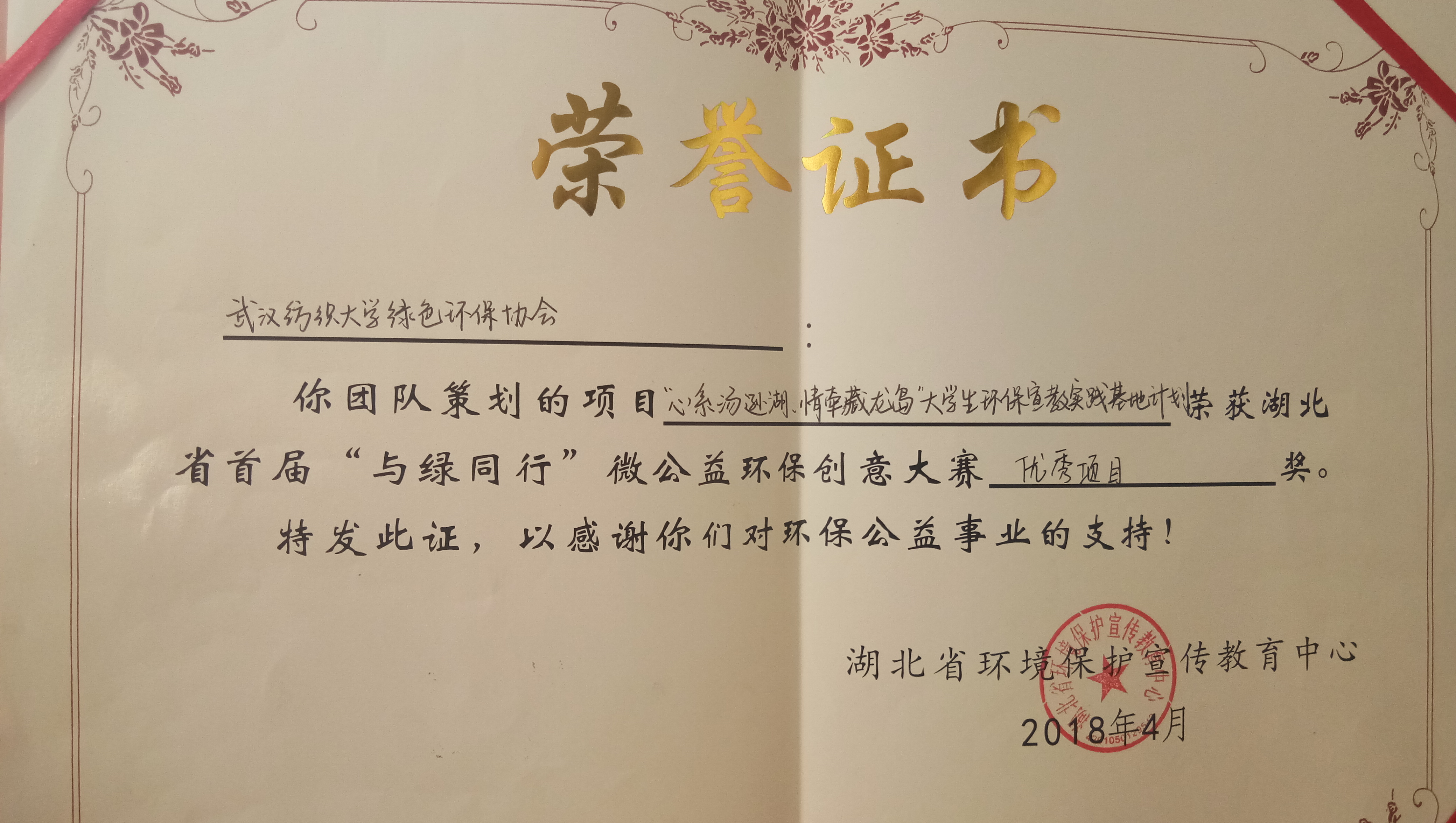 由湖北省环境保护厅主办的湖北省首届“与绿同行”微公益环保创意大赛决赛于2018年4月14日(周六)在湖北省环保厅举行,参加决赛包括华中科技大学、武汉理工大学,等高校在内16个入围团队,最终角逐出8个“优秀项目”和8个“入围项目”。 我校绿协的“心系汤逊湖、情牵藏龙岛”大学生环保宣教实践基地计划获得第一名及2000元项目启动资金。