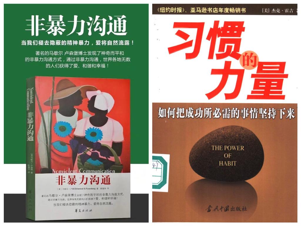 首期读书会为同学们带来两本经典书籍,一本是马歇尔·卢森堡博士的《非暴力沟通》,作者介绍了非暴力沟通的原则和方法,不仅教会了人们如何使个人生活更加和谐美好,也解决了众多世界范围内的冲突和争端;第二本是杰克·霍吉的《习惯的力量》,他告诉我们只有不断改变旧的习惯,确定新习惯,朝着目标坚定不移、努力拼搏的人,才能品味到改变的喜悦。