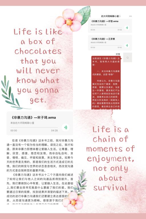 参与本期读书会的同学,有的通过电子书进行碎片化的阅读,有的采用APP听书的方式,还有的保留着传统的纸质书籍阅读方式。尽管形式各不相同,但是大家都从阅读中学习到知识,汲取了力量,每个人都有着不同的收获。建环11902的宋子琦同学说道:“读完这本书,我了解到非暴力沟通的重要性。学会非暴力沟通,我们在以后的生活、工作.上都会受益匪浅。或许是读的速度较快,对其中的某些内容理解的较为浅薄。但我相信随着阅读次数的增多,我会有更深刻的感受。”