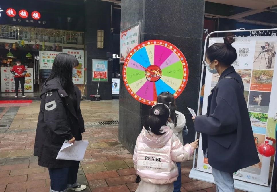 绿色环保协会联合武汉市观鸟协会共同进行。绿协各部门成员积极与社区居民交流,邀请他们填写湿地保护与垃圾分类知识调查问卷,普及环保知识,并带领居民参加各种环保小游戏。活动刚开始时,许多社区居民聚拢在摆点摊前。但是由于居民们尚不了解此次的活动,大多数居民只是站在一旁围观,绿协成员和他们积极的互动,并邀请他们填写问卷,通过问卷了解居民对环保的认识程度。