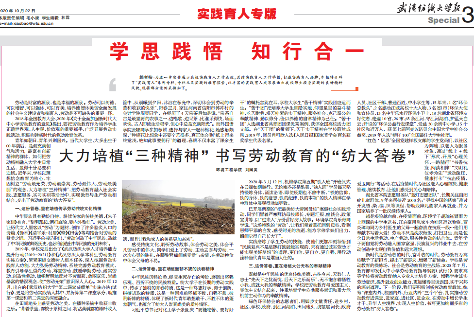 课堂思政融入人才培养。学院确立了“环境为先,生态为魂”的理念,服务“建设美丽中国”国家需求,将课堂教学与思政育人紧密结合,把绿色理念作为环境学子的专业追求融入课堂,增强环境保护的价值认同。在培养方案修订、专业课讲授加大课程思政内容,将习近平生态文明思想、“两山”理论融入教学融入教学各个环节,对未包含思政元素的课程实行“一票否决”;在学生群体中培植锲而不舍的奋斗精神、坚韧不拔的执着精神、小我融入大我的奉献精神,改变学生缺乏劳动意识的“不想劳动”、缺乏劳动本领的“不会劳动”状况。