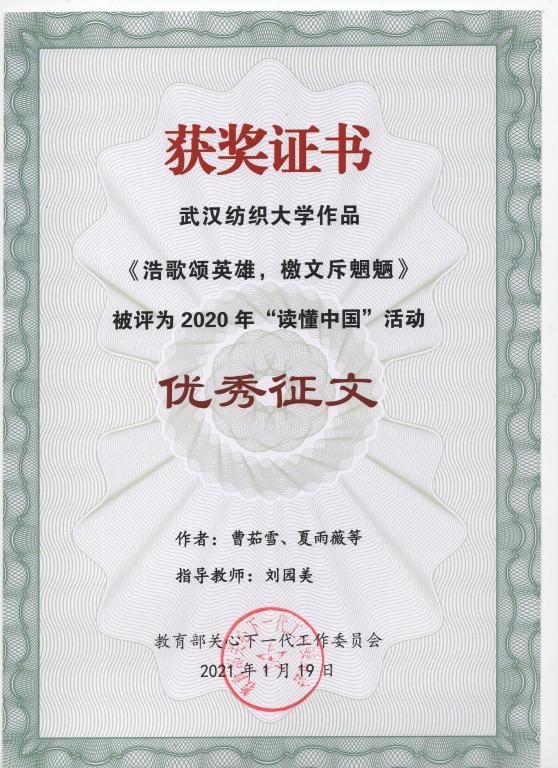 以心育心以德育德。学院把立德树人融入到思政教育、专业教育、实践教育各环节,5年来,承担省级以上实践育人课题6项,其中《美丽中国,我是行动者》和《“红色·忆思队”寻访革命前辈》分获2018、2019年湖北省实践育人重点、重大支持;3人获评优秀班主任,获得“我们爱上思政课”全国一等奖;学工人在“纺织之光”教学改革研究项目、社会实践一流课程等建设上主动融入;在中国纺织职工思政研究会奖励、第四届中国纺织类高校创意创新创业大赛、省教育厅哲学社会科学项目均取得突破,深入系统的研究转化为服务学生培根铸魂、启智润心提供支撑。