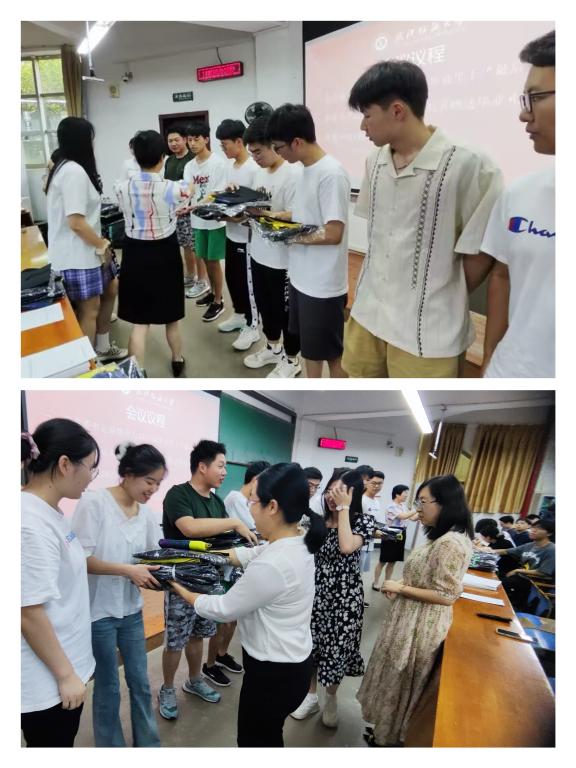 会上,学院领导班子还向毕业生代表赠送了毕业纪念礼物并合影留念。一件件带有学院专属LOGO的学士服,一架架由学弟学妹们亲手折叠的装满祝福的梦想启航飞机,是学院为毕业生精心准备的毕业礼物。“笃学创新,知行合一”的院训,承载着学院对于莘莘学子的殷切希望,将时刻勉励学子在新的工作岗位、新的学校继续书写青春华章。