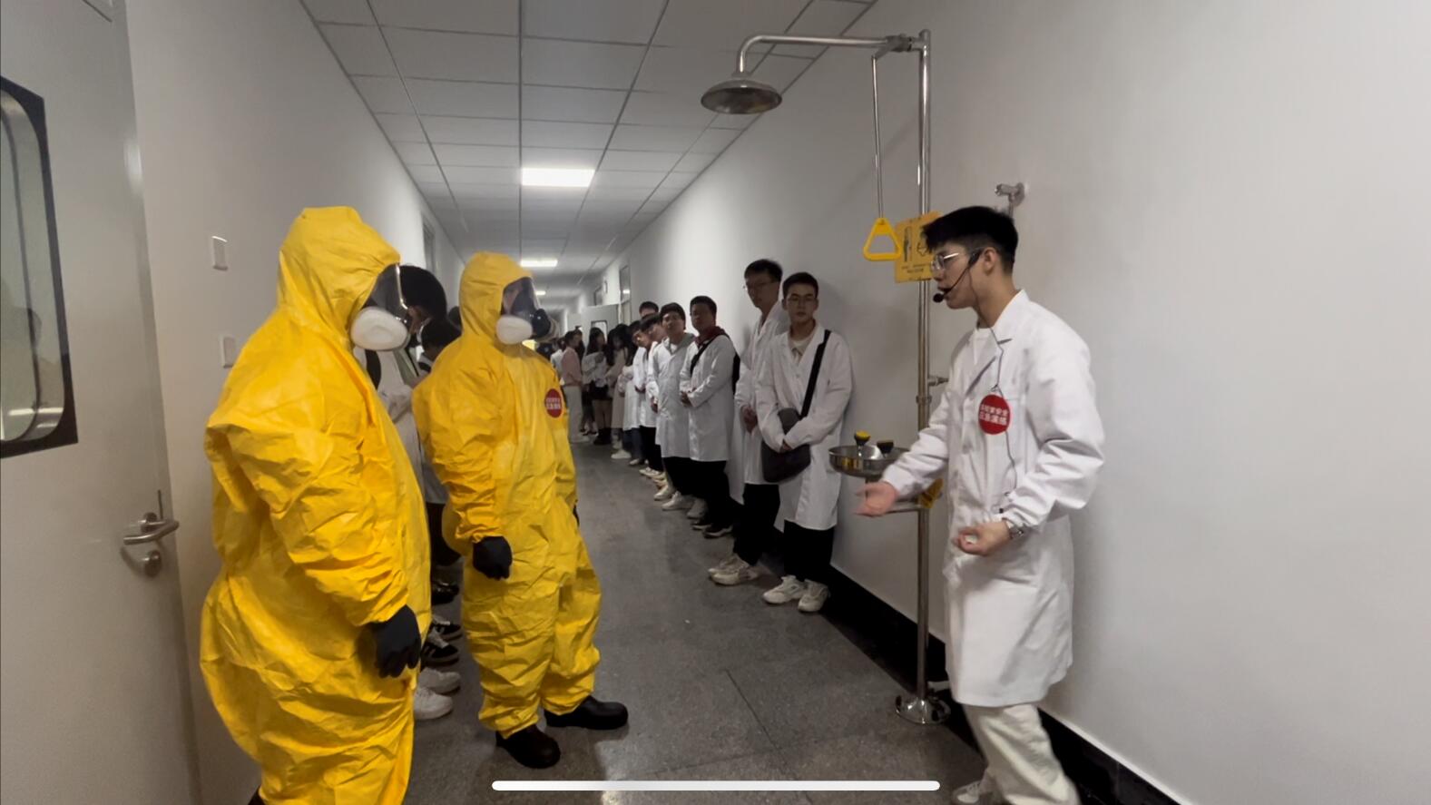 下午14点,演练正式开始。一名学生模拟在实验过程中不慎将浓硝酸洒出,伴随“浓硝酸泄漏”的警报声,指导老师迅速反应,口头通知学生立即停止实验,保持冷静,划出风险区、封闭实验室,并向上级领导汇报。参与演练的师生们沉着冷静,按照预定的疏散路线,迅速而有序地撤离实验室。
