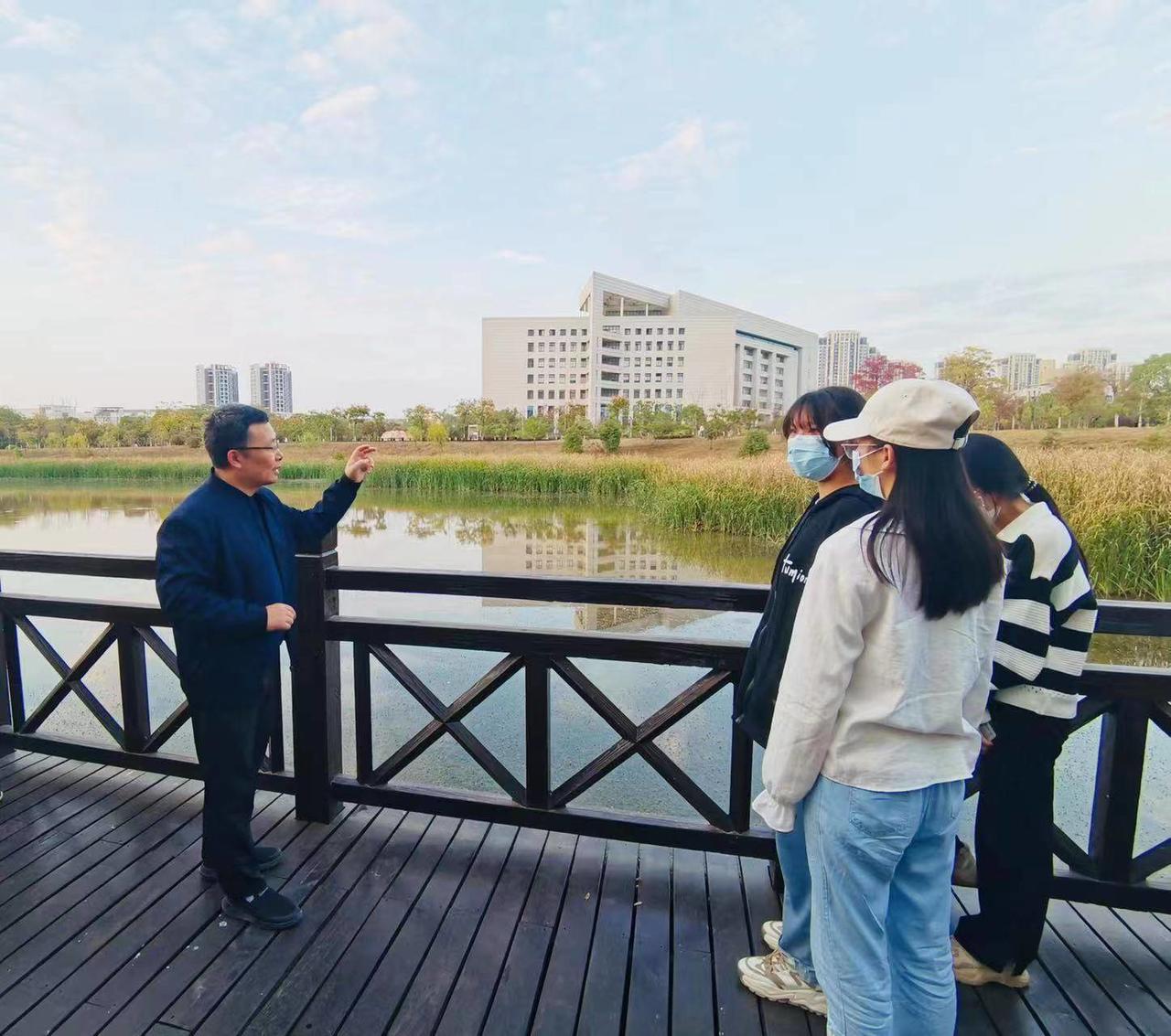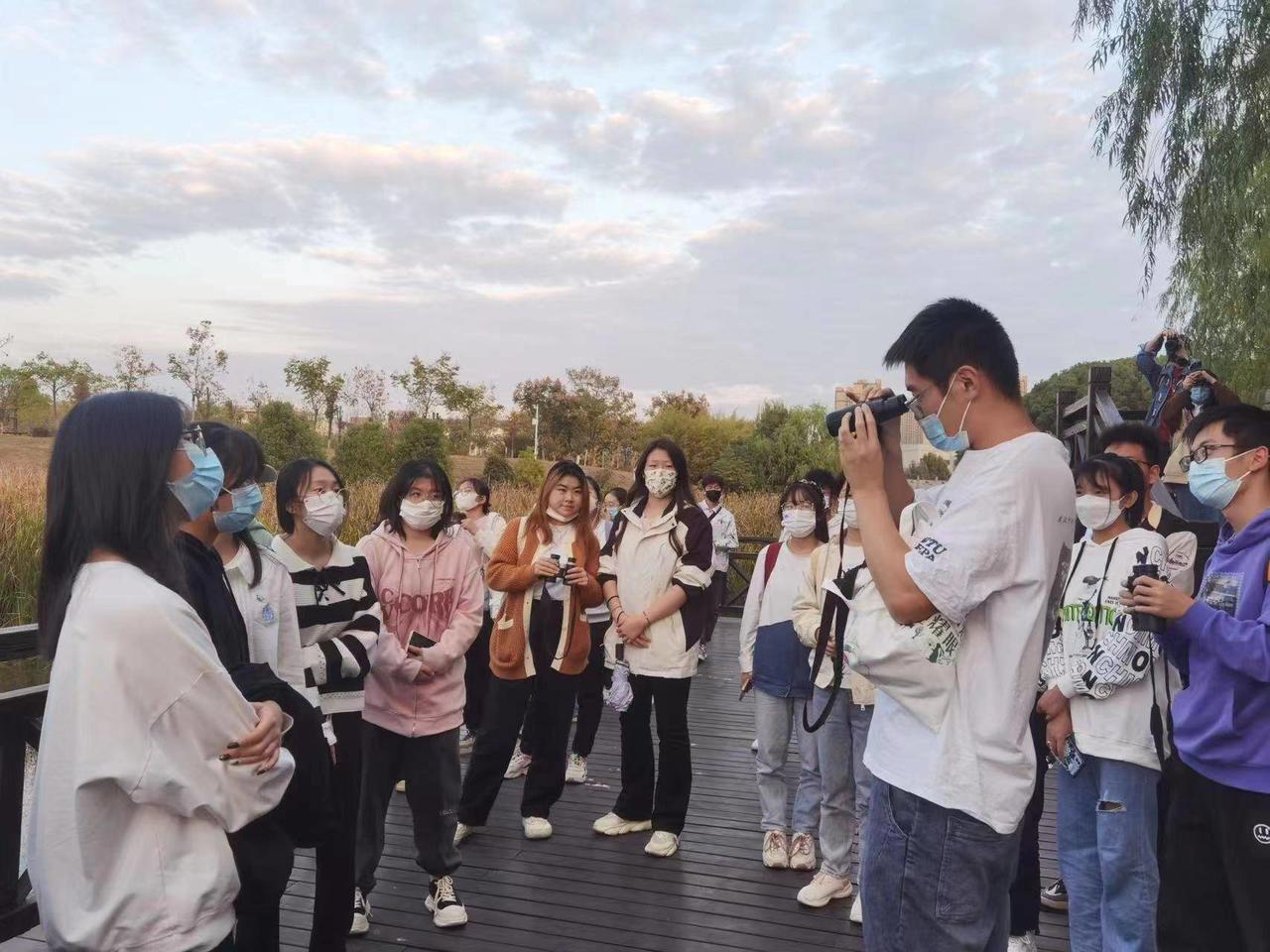 “流水如有意,暮禽相与还,同学们看夕阳下的中锦湖中要正在打盹的绿头鸭、枝头上有探头探脑的灰喜鹊,它们都是湿地生态系统中的组成部分。”11月8日下午,百花堂