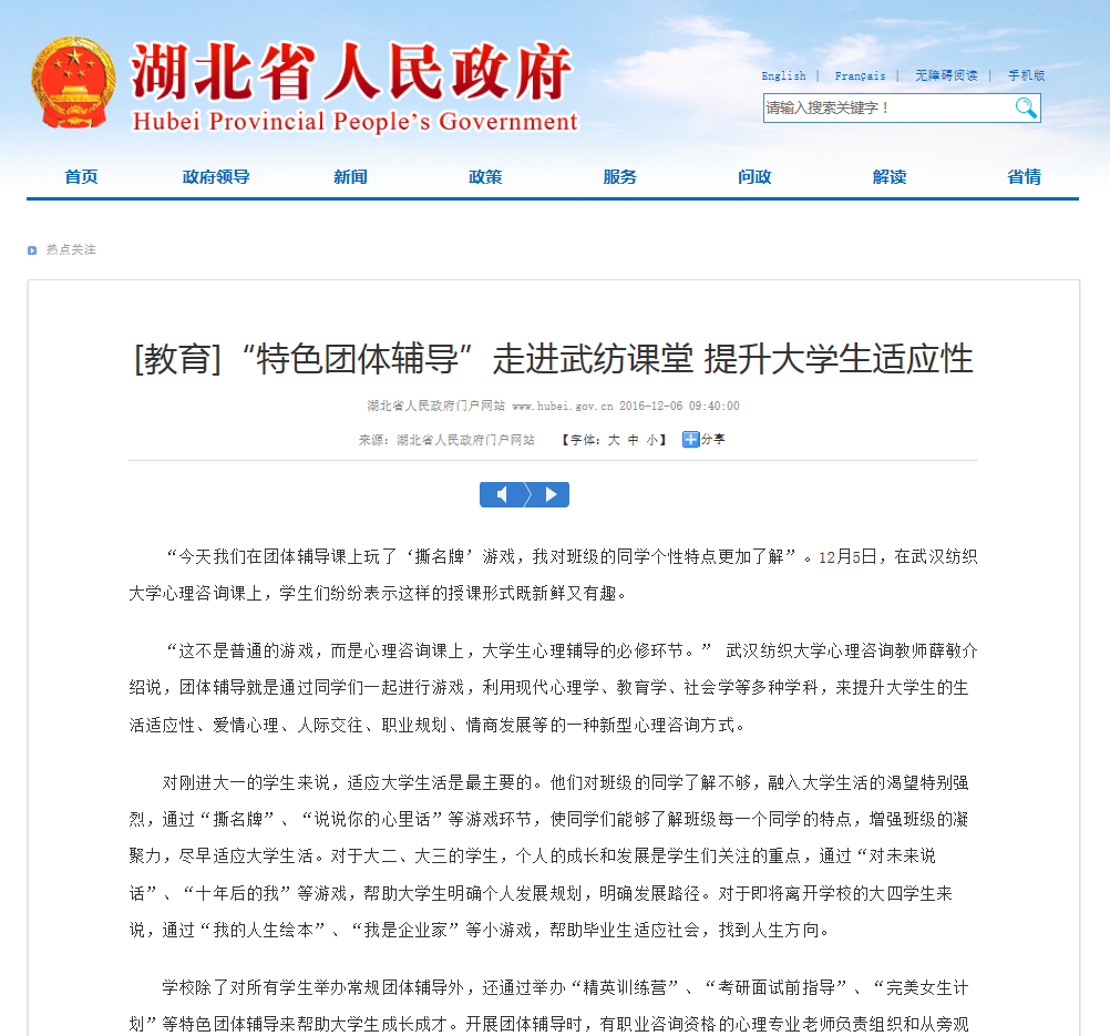 心理咨询教师薛敏介绍说,团体辅导就是通过同学们一起进行游戏,利用现代心理学、教育学、社会学等多种学科,来提升大学生的生活适应性、爱情心理、人际交往、职业规划、情商发展等的一种新型心理咨询方式。
