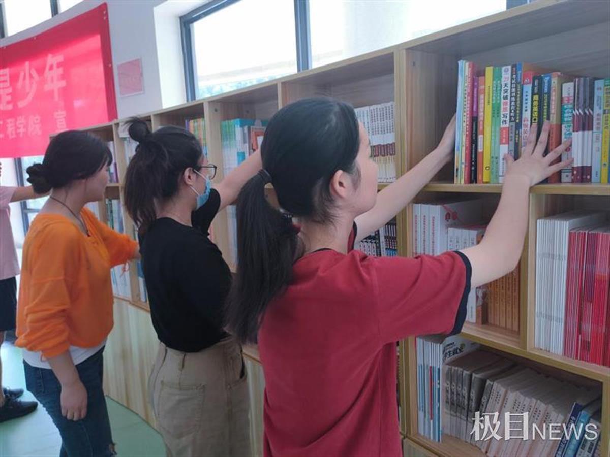 捐书现场,毕业生们有的认真清点捐赠的书本,有的踮脚整理书架上的书籍,有的弯腰清扫地上的灰尘,毕业生夏雨薇还郑重地在捐出的每一本书上写下“中国有梦,青春无悔”的勉励语。