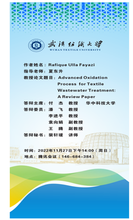 于2022年11月27日举行了2022年硕士研究生(留学生)毕业论文答辩(秋季),留学生Rafique Ulla Fayazi(拉菲克)参与了论文答辩环节,答辩会邀请了华中科技大学环境科学与工程学院付杰教授担任答辩主席,并邀请多位相关学科学者(专家)担任答辩委员会成员。