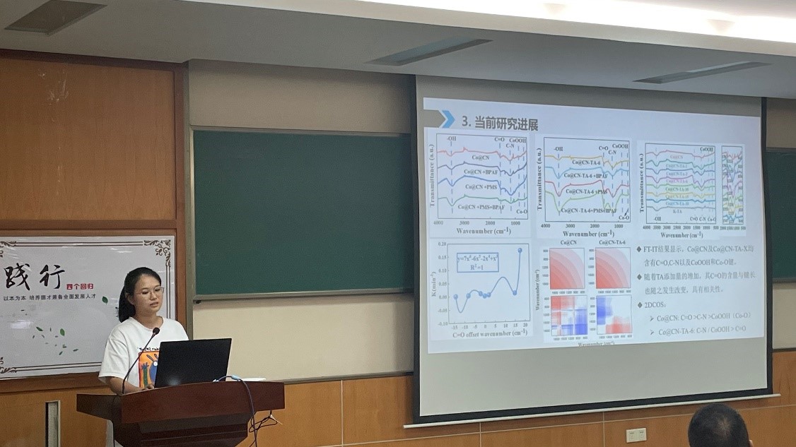 王炜珊同学通过调控生物炭中sp2杂化的相对含量,使电子更容易发生跃迁并抑制电子复合,从而提高生物炭的光热转换性能。该技术可有效使用废水产生清洁水,实现有机高盐废水的低碳排放处理及资源化回用。张一鸣同学通过氧化铁的非金属掺杂调控,以提高过硫酸盐催化过程中的界面电子转移速率,实现对污染物的高效降解。形成的新活性位点与污染物相互作用,调控了催化路径,具有良好的环境适应性,为开发高活性铁基材料提出了新的策略。吴莉同学研究在碳化氮上构建B、Cu电子键桥形成局部极化电场,加速类芬顿中界面电子转移速率,从而废水中污染物的降解速率提升了16倍。该体系具有良好的水体适应性及稳定性。