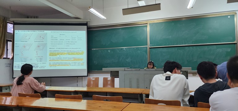 张亚琪同学结合课题组前期研究,概述了非自由基定向活化系统中碳结构和电子转移间构效关系。研究发现F掺杂提高了碳材料的催化活性,将过硫酸盐活化过程转变为基于电子转移的非自由基过程。朱泽鑫同学关注在环境修复中的纳米约束效应,在一种新型的过硫酸盐活化体系中,通过表面约束效应加速了催化氧化过程。这项工作提供了关于表面约束效应在类芬顿反应中应用的重要作用,为环境修复提供了一定的参考。