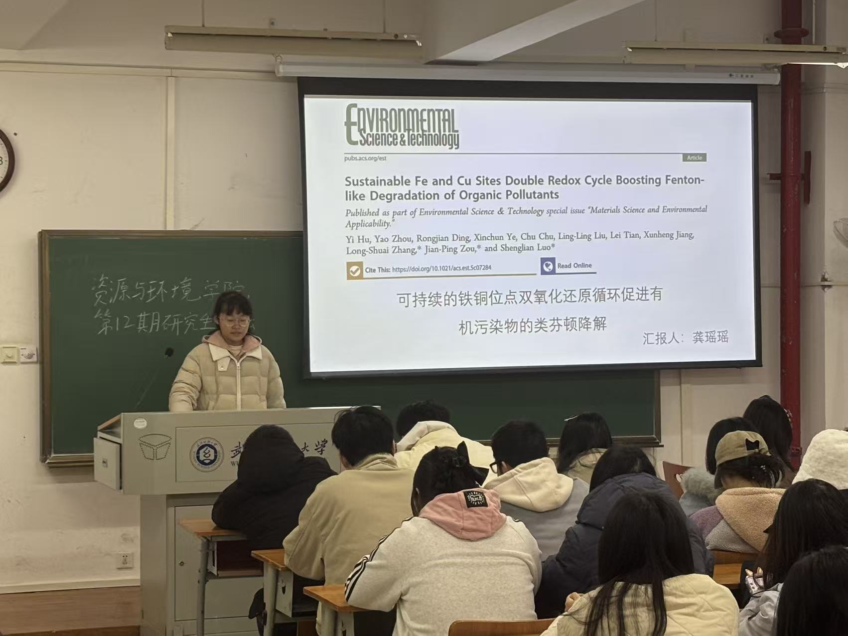 李雪颖同学围绕“通过原位生成MnO纳米颗粒调控碳纤维电子结构及类芬顿氧化路径”展开,讲解采用原位合成法在碳纤维表面生成了均匀分散的MnO纳米颗粒,借助MnO与碳纤维间的界面相互作用,调控了碳纤维的电子结构,优化了类芬顿反应中电子的传输效率,同时改变了过氧化物的活化路径,提升了污染物降解的效率和选择性。