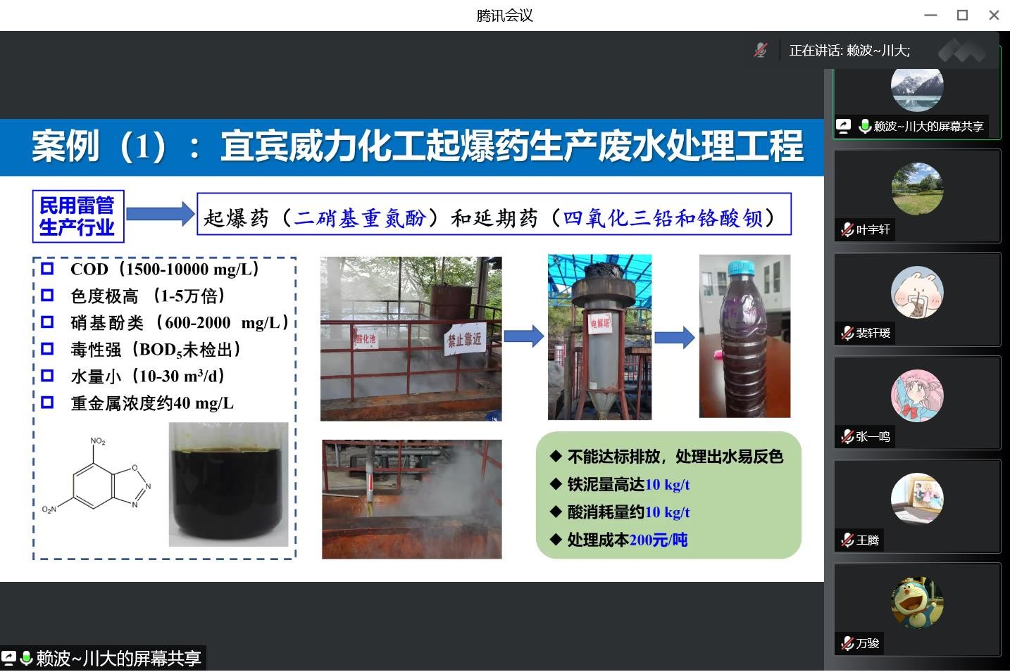 赖波教授分析了纳米零价铁在工程化应用中面临的制备成本高、反应活性过高、不易保存运输等问题,提出其核心关键点在于如何提高电子利用率。为解决该瓶颈问题,赖教授团队提出零价铁旋流体技术,强化微米零价铁在反应过程中的一系列物理化学变化,并将该技术做成配套装备用于工程实践。为便于师生理解,赖教授详细讲解了化工起爆药生产废水、火药生产废水、化工中间体生产废水以及制革高浓度有机磷鞣剂处理的实际案例,结合相关行业实际,解析了关键技术在不同废水中的应用优势及问题;对零价铁技术的应用提出了思考,对零价铁用于高附加值工业废水市场的发展前景进行展望。此外,赖教授希望大学生改变固有思维模式,能从学习知识转变为创造知识,能利用已有的知识创造新理论、新工艺、新材料、新装备,真正履行作为环保卫士的职责和义务。报告结束后,参会师生针对讲座内容进行踊跃提问,赖波教授对这些问题进行了细致解答。