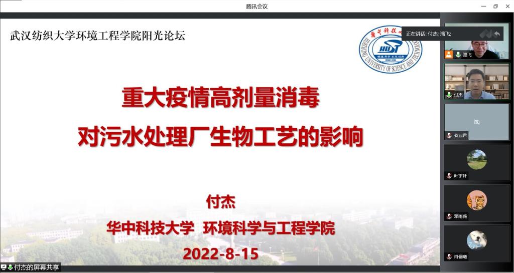 8月15日上午,学院在线上举办第181期阳光论坛。本次论坛邀请了华中科技大学付杰教授作了题为“重大疫情高剂量消毒对污水处理厂生物工艺的影响”的报告。论坛由环境工程学院院长潘飞教授主持,学院教师和研究生参与了此次论坛。