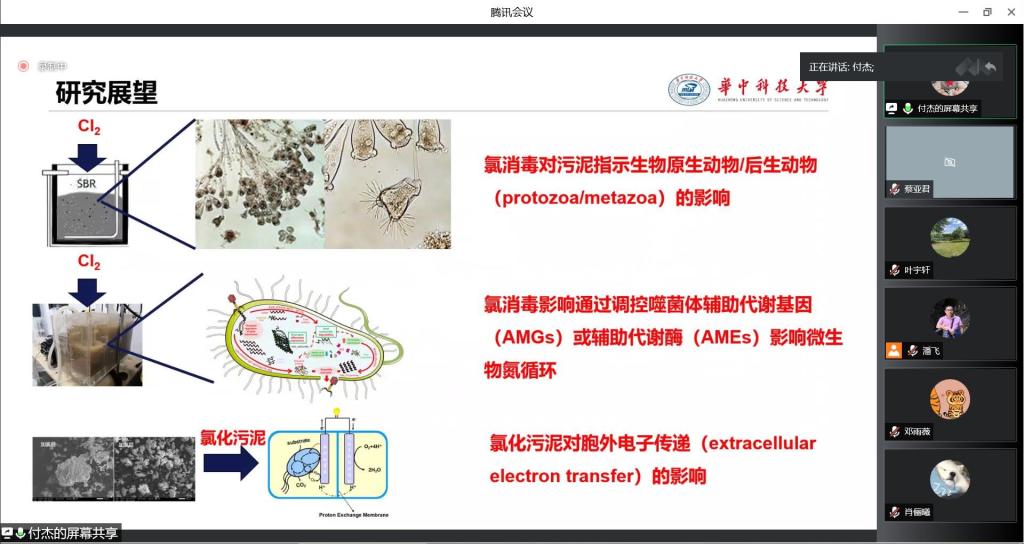 付杰教授首先从新冠肺炎疫情出发,强调加强杀菌消毒的必要性,并分析了高剂量消毒过程加速抗生素耐药性传播的途径。在谈到消毒过程对污水厂生物处理的影响时,他从污水处理厂的调研结果和高剂量氯消毒过程两方面展开,深入探究氯消毒对反应器运行效能、细菌群落分化、宏基因组的变化、氯抗性基因、抗氯机制等多方面的影响。此外,付杰教授还结合前期的研究,分享了未来即将开展的研究规划以及开展调研课题、政府提案、社情民意的情况。报告结束后,参会师生针对讲座内容进行踊跃提问,付杰教授对这些问题进行了细致解答。