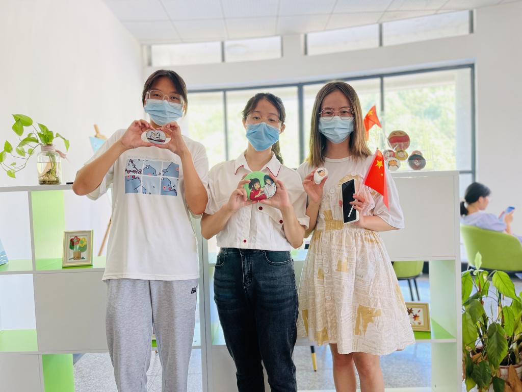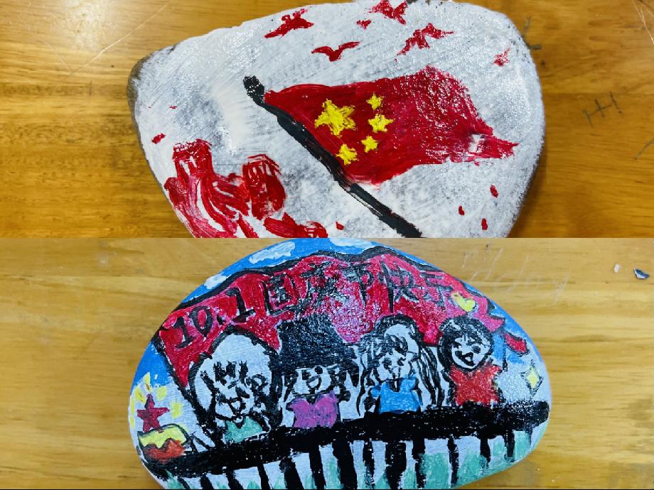 鲜艳的五星红旗、雄伟的天安门......一个个图案,创意满满,一颗颗石头在同学们的用心点缀下成为一份份精致小巧的献给祖国母亲的生日贺礼。