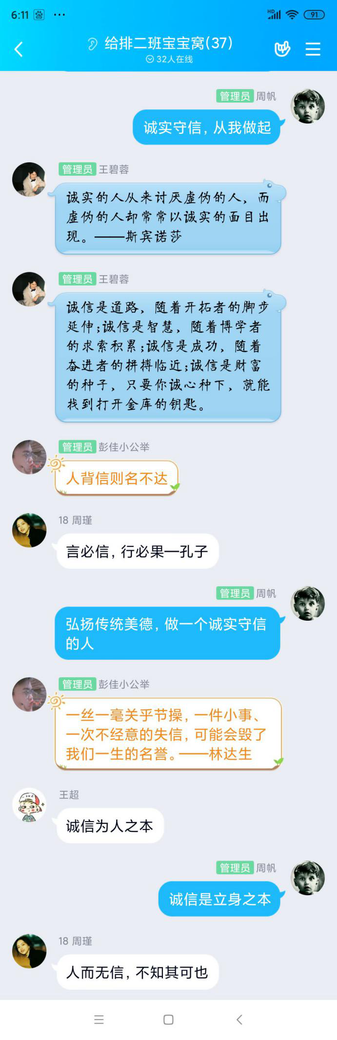 会议中,详细的向同学们介绍了生源地信用助学贷款及还款简介,重点提醒大家需要注意的事项,并一一解答了同学们的疑问。为鼓舞人心大家还一起在班群里发出了自己的诚信宣言。这次在线上开展的班会丝毫没有到影响大家的热情与专注,同学们都准时参与、认真投入,不错过任何细节。最后,对于即将面临的期末考试,结合“诚信”这个主题,班长们附加强调了诚信考试的要求,希望同学们对自己负责,认真复习,祝福大家都能取得好成绩。