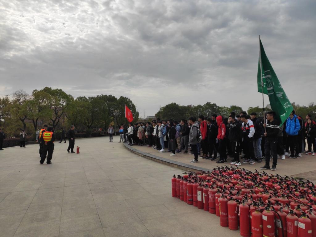 在图书馆门前广场上举行了消防安全演练,各班同学们积极参加本次演习,学习消防实践知识。
