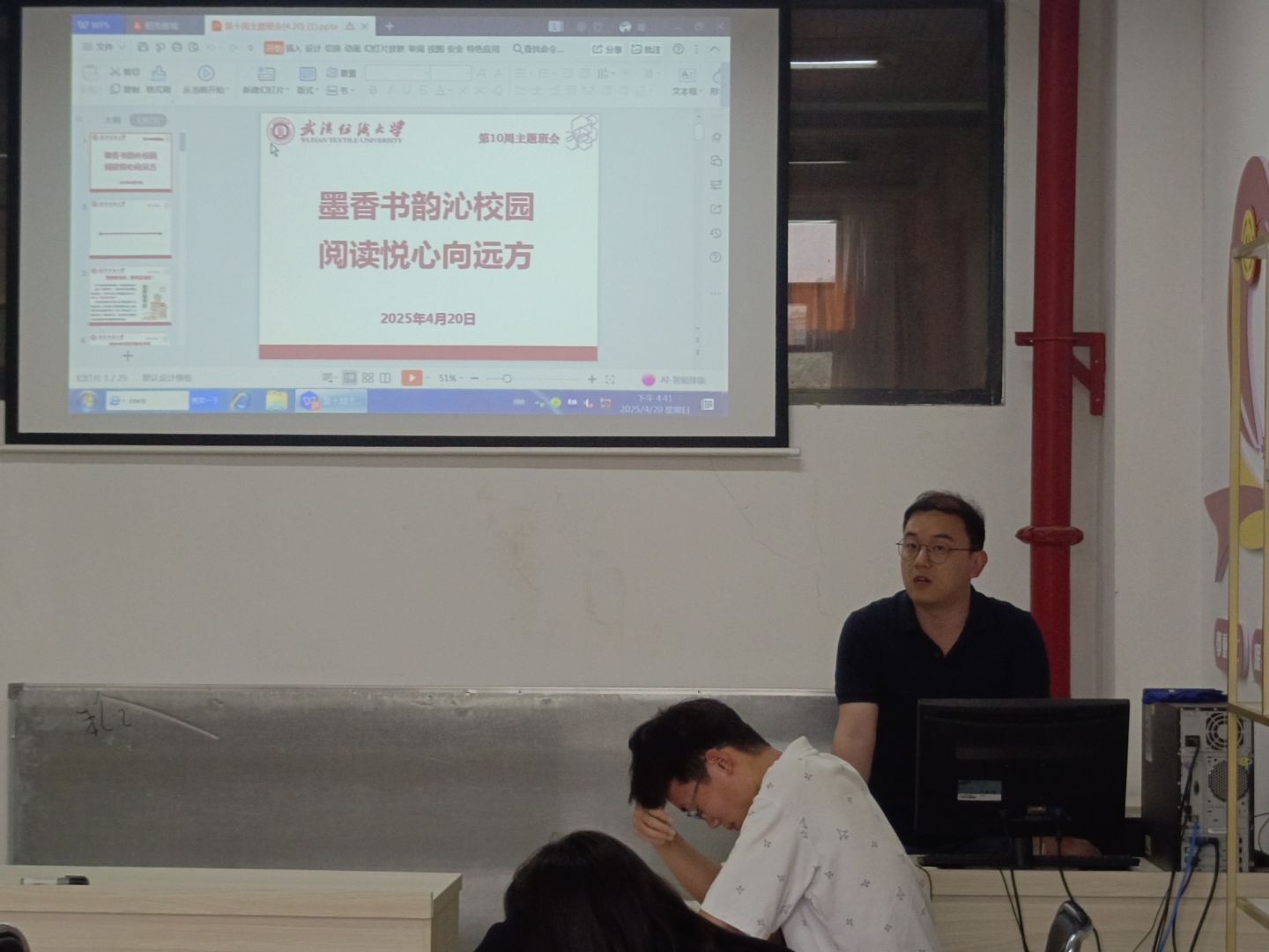 结合学校第二十二届读书月活动,年级辅导员向同学们介绍了“书雅乐游园会”“新质生产力主题书展”“数字资源推介展”等系列活动,号召同学们积极参与“书评影评大赛”“朗读大赛”等活动,在互动中感受阅读魅力,为校园文化建设注入活力。