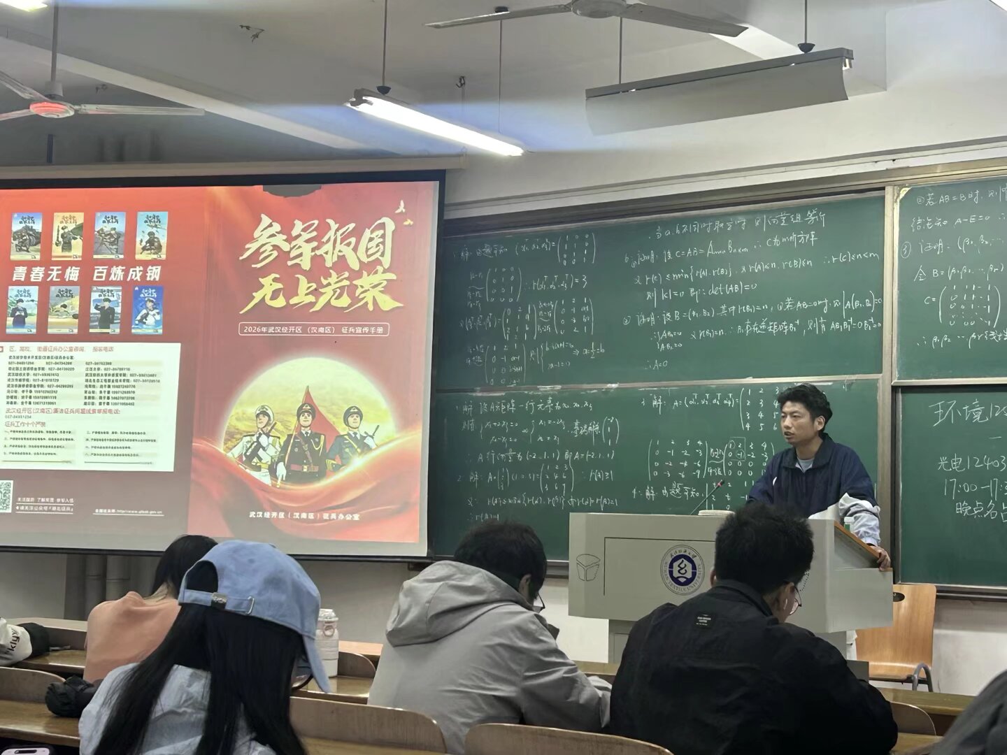 为通过身边人、身边事,更好的激发同学们参军入伍的激情,学院邀请今年退伍复兴的大学生士兵罗启兵开展征兵宣传朋辈交流活动。学院征兵联络员、2022级辅导员郁星从报名条件、选拔流程、福利待遇等方面进行了深入介绍,退役大学生士兵罗启兵以自己的军旅生涯为切入点,从为什么要入伍、入伍对自己的成长帮助、退役后回到学校的感受等方面进行分享,让同学们更加直观地感受到军人的风采和担当,号召同学们积极关注征兵工作,激发了同学们的爱国热情和报国志向。同时,组织有报名意愿的同学们加入2026年春季征兵宣传群,方便随时了解征兵政策和报名信息。