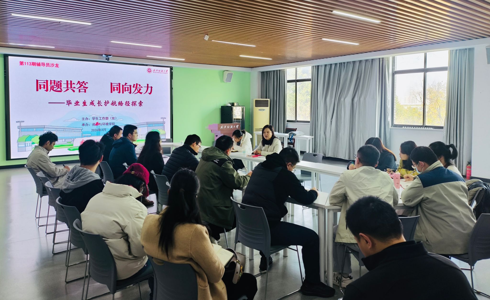 承办的第113期辅导员沙龙“同题共答 同向发力——毕业生成长护航路径探索”,在大学生活动中心207会议室成功举行。学工部部长张莎莎、各学院辅导员代表参加活动,资环学院党委副书记姚瑶主持。