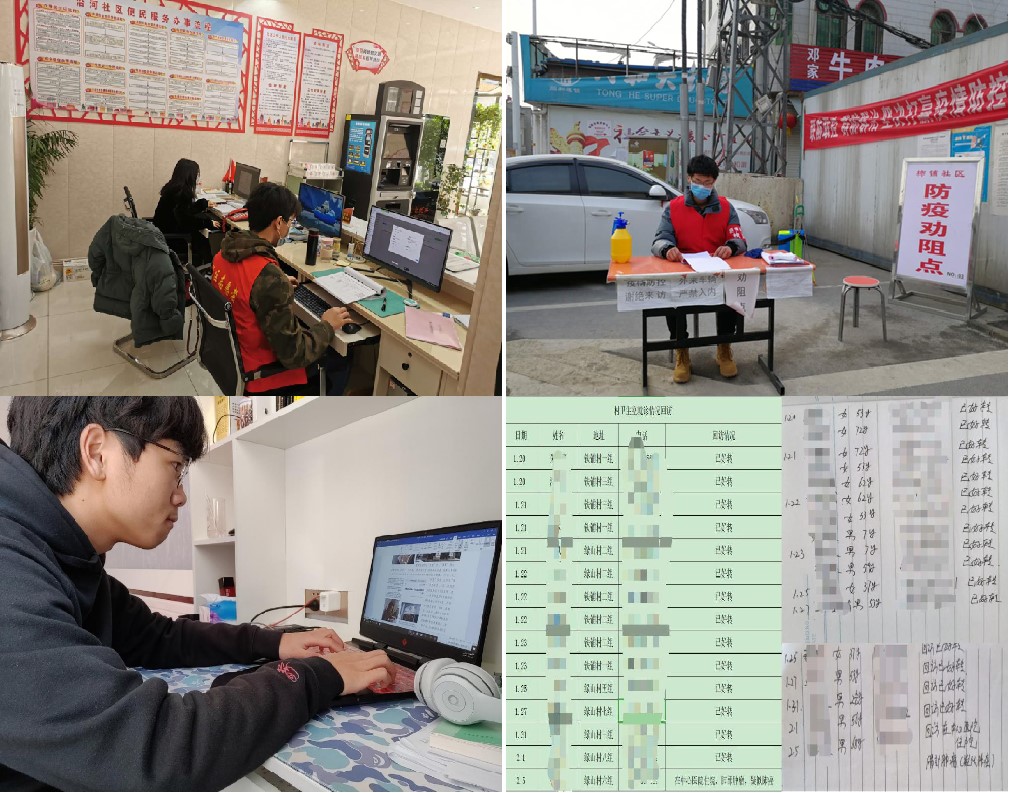 环境科学专业大一学生张思羽,在社区做志愿者一个多月,上门排查体温、宣传注意事项、组织物资团购及耐心教老人打卡湖北健康码等,忙的不亦乐乎;建环专业大一学生陈兢,持续开展线上防疫宣传,经他手审稿达50多篇无一差错;同专业大一学生贾炎璋,受同为乡村医生父母的影响,每天早早帮父母把村民的信息、病患跟进情况整理出来,做好记录和统计,在他们需要的时候快速提供;而建环专业大四学生向苗,在留意网上找工作的同时,把卡口当成了防疫战场,一干就是20多天。