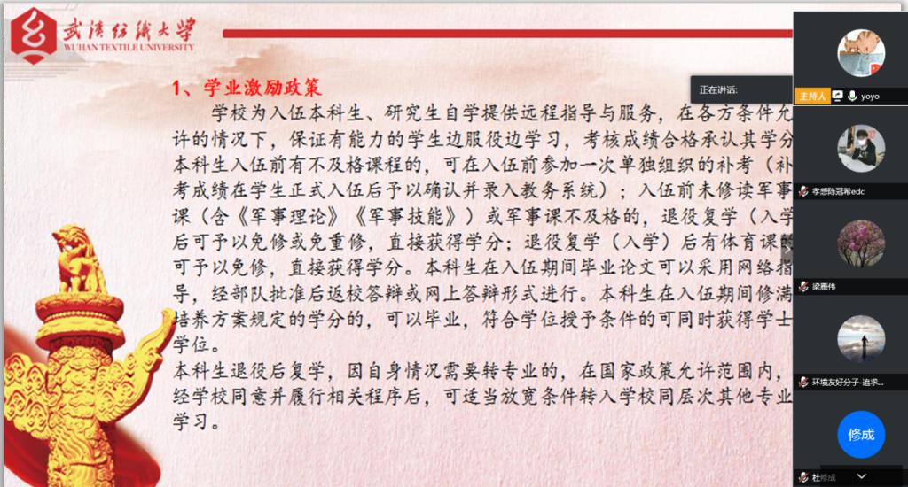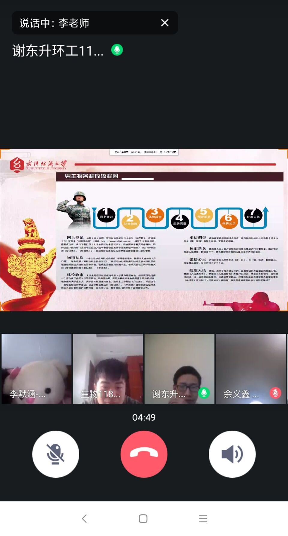 4月下旬,环境学院辅导员姚瑶、李文倩、刘文祥等,在各自年级开展了线上“志存高远砺青春,建功立业赴军营”征兵动员大会。会上播放了相关征兵宣传片,号召学生心系国防,勇担强军使命。同时,详细解读参军入伍应征条件、应征流程、优待政策、发展途径以及经济补助等问题,为百花堂