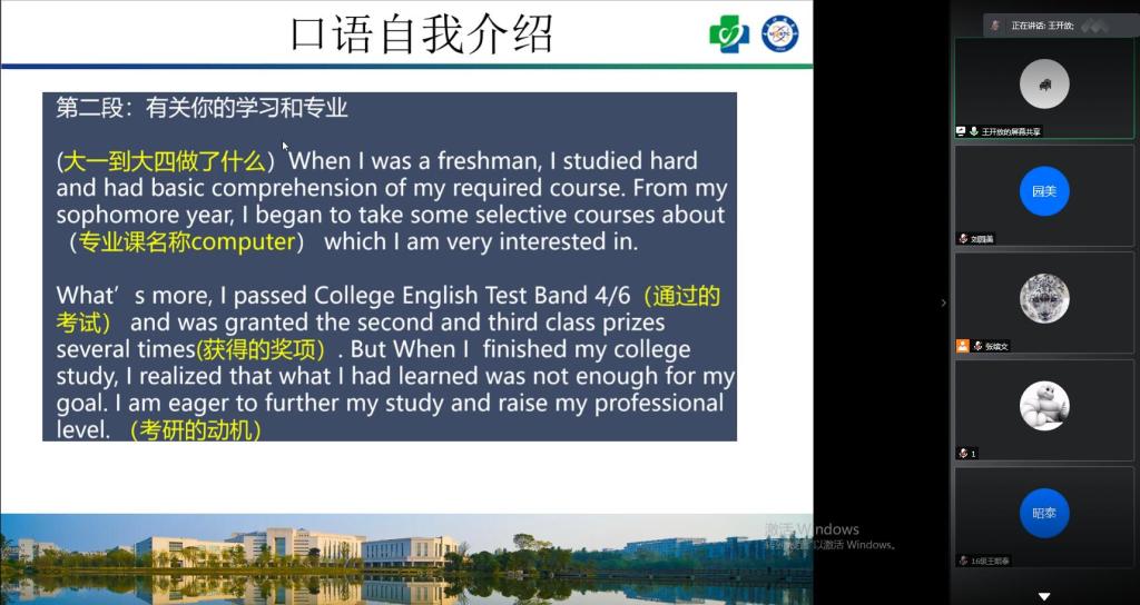 詹铭志从复试基本情况介绍、复试的核心问题及面试注意事项等三个方面为同学们答疑解惑,建议大家多方面了解不同学校的复试要求,从计划准备、条件准备、心理准备、表达准备和问题准备等方面做好复试准备、积极备考;王昭泰以自己经历为例,从远程复试设备准备、线上面试和专业面试三方面做了详细解答,建议大家做好英语自我介绍,事先进行模拟问答;王开放从复试流程、复试内容、复试注意事项、调剂注意事项等四个方面为同学们进行分享,特别要注重英语口语的前期准备,冷静思考、沉着应对,客观作答,争取取得优异成绩。