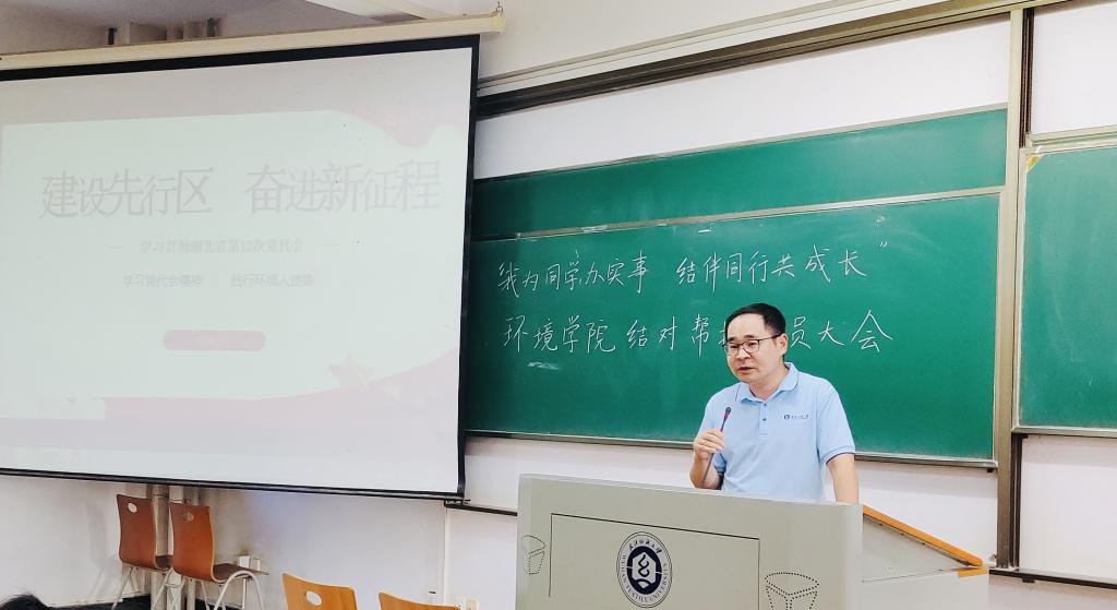 潘飞围绕大会主题、过去五年七大成就、未来五年总体要求、全面贯彻新发展理念、构建新发展格局先行区等内容为学生党员们解读了湖北省第十二次党代会精神,为今后发展指明了方向。潘飞结合环境学院的发展特色,深入解读了湖北省先行区建设蓝图中的“环境”底色。他强调湖北省长期以来坚持的生态优先、绿色发展,以长江大保护为重点的污染防治攻坚战战略将给环境专业学科带来前所未有的发展机遇,当代青年学子应在学习、实践中贯彻落实党代会精神,坚定理想信念,砥砺过硬本领,发挥专业所长,在社会实践舞台上大有作为。