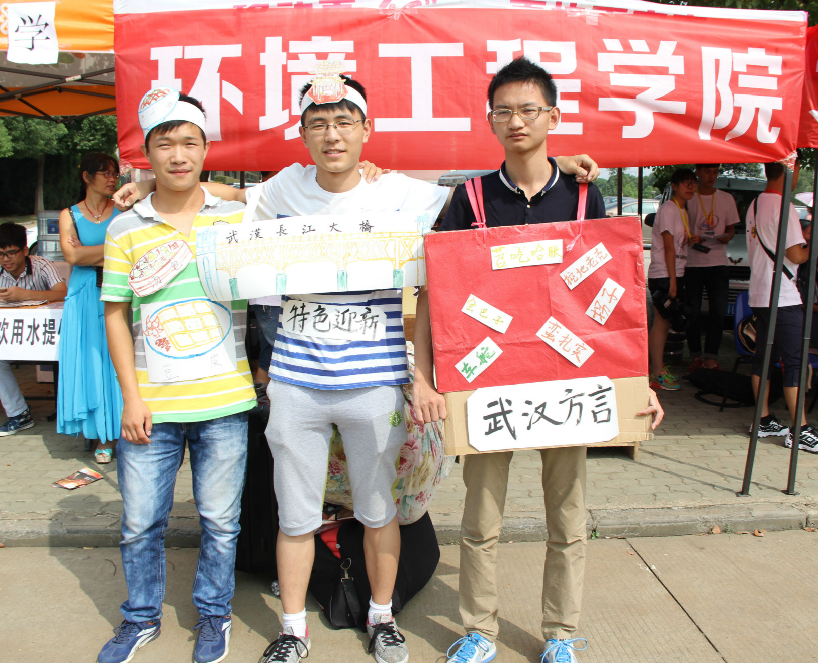 “欢迎新同学加入环境学院大家庭!”三名造型奇特的同学用一口正宗的武汉本地方言,向前来报到的新生和家长打着招呼。他们是环境学院三位江夏区本地的新生自发组成的“迎新小分队”。“我们利用暑假时间自制了“黄鹤楼”、“热干面”、“长江大桥”等头饰服饰,今天我们要以主人翁的姿态,向新同学介绍和宣传咱们武汉本地的文化特色。”小分队成员胡志强说。这三个活泼可爱的新生,身上贴着“拐子”“正满”等俏皮的武汉特色方言,吸引了众多眼球。环境学院首次组织新生参与迎新工作,并用家乡话欢迎新同学,这种创新、接地气的方式,既增加了迎新乐趣,同时也让新生感受到了家的温暖。