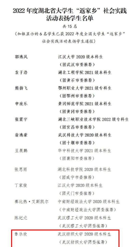 2022年度湖北省大学生“返家乡” 社会实践活旨在引导广大青年学生在家乡的热土上、在实践的课堂中受教育、长才干、作贡献,进一步彰显育人实效。经基层申报、各地各单位团组织推荐、组织评议等环节,对表现突出的17个单位、6名工作者、15名学生、6个项目予以通报表扬,章乐欣是我校唯一获表彰的同学。