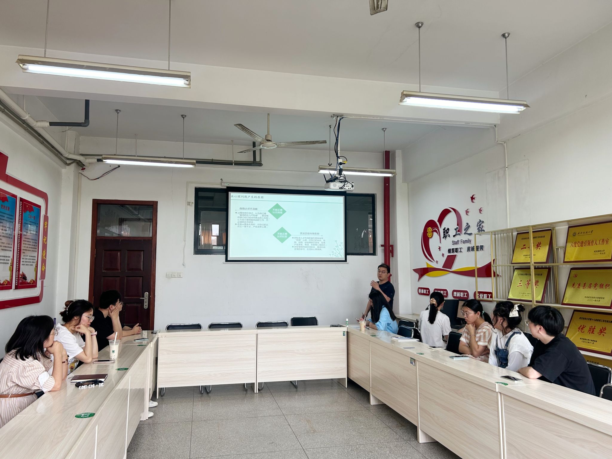 两位德育导师结合自身就业经历,围绕就业常见的心理困扰、如何进行调试和压力应对等内容展开讲座。叶宇轩鼓励学生们调整就业心态,了解目前就业形势,同时结合自身的兴趣、研究方向、特长等,正视就业困难,充分认识专业职业价值,树立正确的职业价值观。杨璐就环境专业就业方向进行了介绍,就环保相关行业、国企、事业单位的环保岗位、武汉市的环境咨询类企业的求职方式进行分析,为毕业生指明就业方向。
