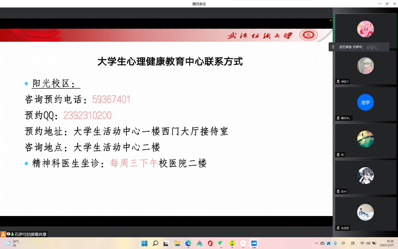 各年级辅导员向同学们讲述心理健康知识,根据不同年级同学们的心理特征,为同学们讲授各阶段调节情绪的方式。针对低年级同学,侧重于帮助同学们更好的认识自我,悦纳自我、缓解疫情下的学业焦虑和建立阶段性目标,通过画“生命之树”、寻找“生命之重”等小游戏与同学们进行双向互动。针对高年级同学,侧重于考研压力和就业压力的疏导,鼓励同学们抓住线上线下的各类资源,提高自身能力,寻找适合自己的发展方向。