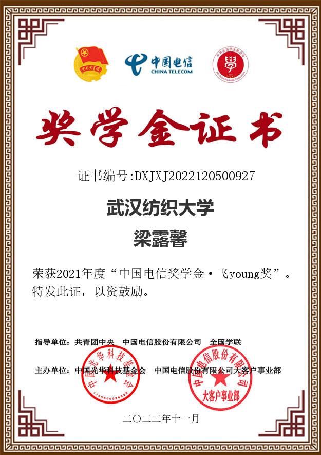 “中国电信奖学金”是由共青团中央、中国电信集团公司、全国学联自2014年起联合设立的,旨在广大青年学生中深入开展培育和践行社会主义核心价值观活动,发掘、树立、宣传优秀青年学生典型,对其进行表彰与奖励。经校级推荐、省级初评和全国评审,本年度全国范围内共评选产生“中国电信奖学金·天翼奖”获得者98名,“中国电信奖学金•飞Young奖”获得者1486名,粱露馨是我校唯一获奖学生。
