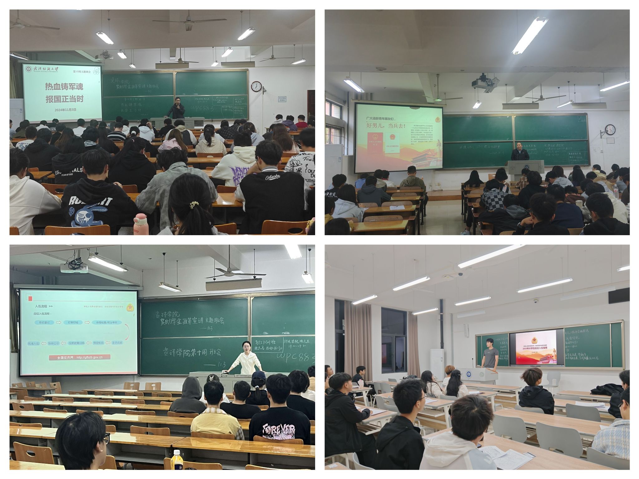 11月3日,副书记、各年级辅导员、班主任、退役士兵代表分年级、班级开展了“热血铸军魂、报过正当时”主题班会暨征兵政策宣讲会。班会上,同学们集体观看了2025年征兵宣传片,老师们详细解读了入伍待遇、入伍条件、入伍流程环节,普及入伍常识,让同学们有了更为全面和深入的了解。
