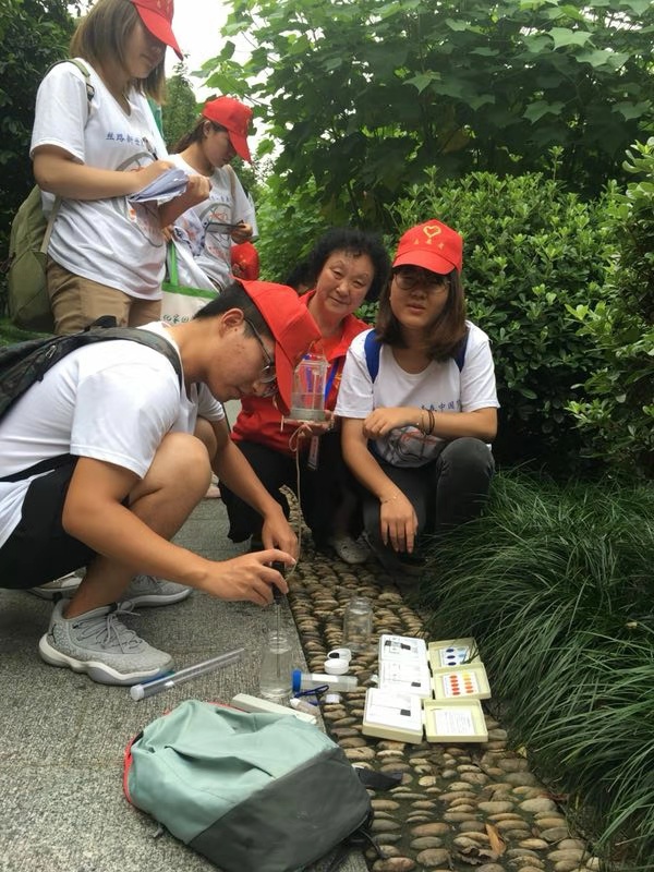 在接下来的环节里,李勤爱带着学生们巡查沿山河道,他们来到河岸边,拿出事先准备好的水质监测仪器,大家一起动手操作,检测水质,共同参与绿色环保行动。