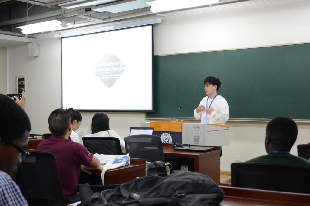 在个人演讲环节中,刘行韬同学向来自世界各国的同学们展示了我国两种重要保护动物——白鳍豚及中华鲟的生态现状,并号召青年学子保持对身边生态环境及生物多样性的关注,将所学知识应用到环境及生态的保护工作中去。