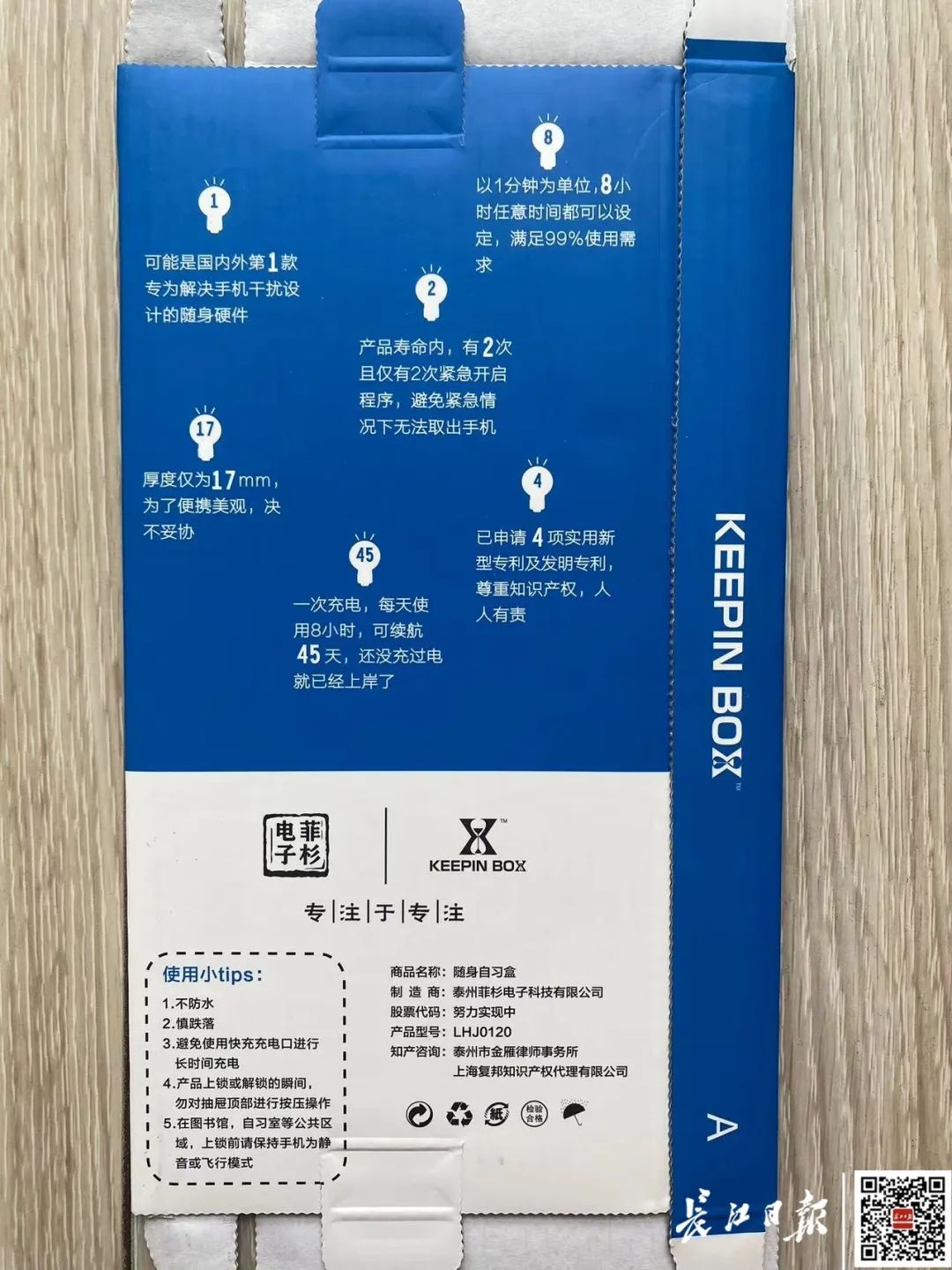 堵舜设计的第一代手机定时盒(当时名叫“随身自习盒”)的产品外包装。记者蔡欣星 摄