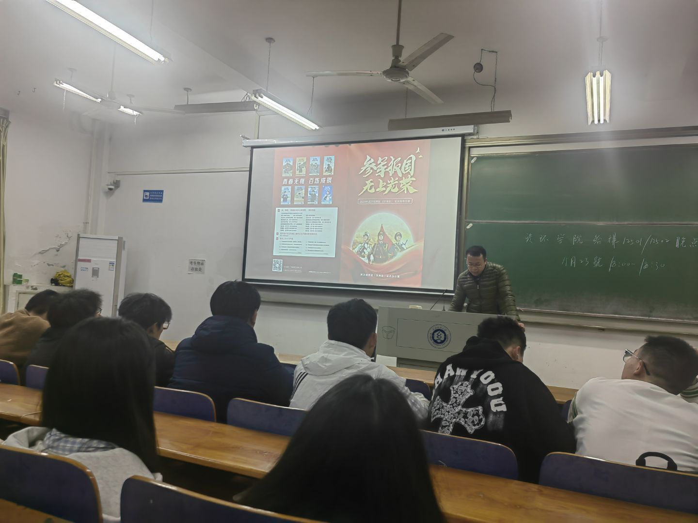 为通过身边人、身边事,更好的激发同学们参军入伍的激情,学院邀请今年退伍复兴的大学生士兵罗启兵开展征兵宣传朋辈交流活动。学院征兵联络员、2022级辅导员郁星从报名条件、选拔流程、福利待遇等方面进行了深入介绍,退役大学生士兵罗启兵以自己的军旅生涯为切入点,从为什么要入伍、入伍对自己的成长帮助、退役后回到学校的感受等方面进行分享,让同学们更加直观地感受到军人的风采和担当,号召同学们积极关注征兵工作,激发了同学们的爱国热情和报国志向。同时,组织有报名意愿的同学们加入2026年春季征兵宣传群,方便随时了解征兵政策和报名信息。
